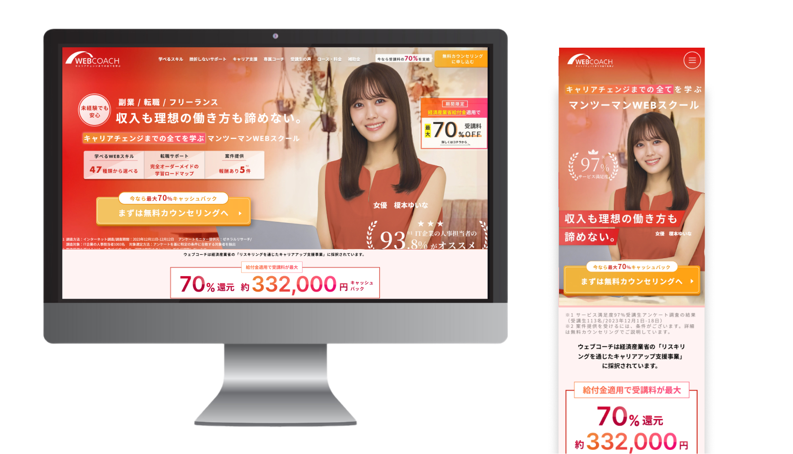 WEBCOACHは、キャリアチェンジまでも全てを学び理想の”収入と働き方”どちらも叶えるためのマンツーマンWEBスクールです。